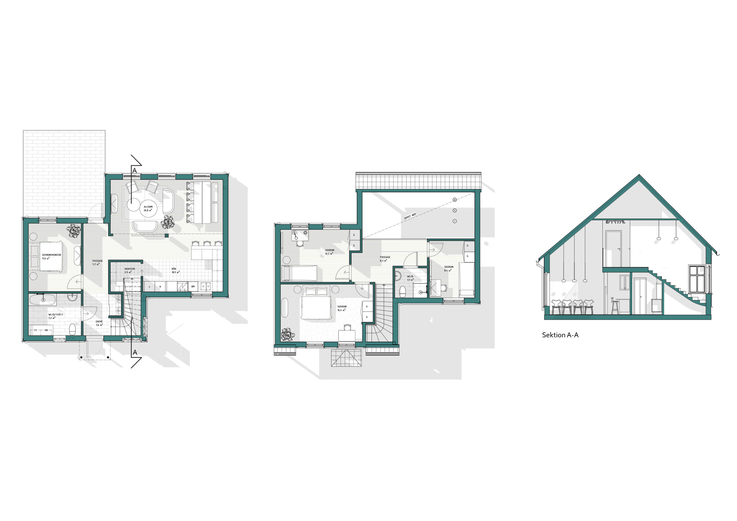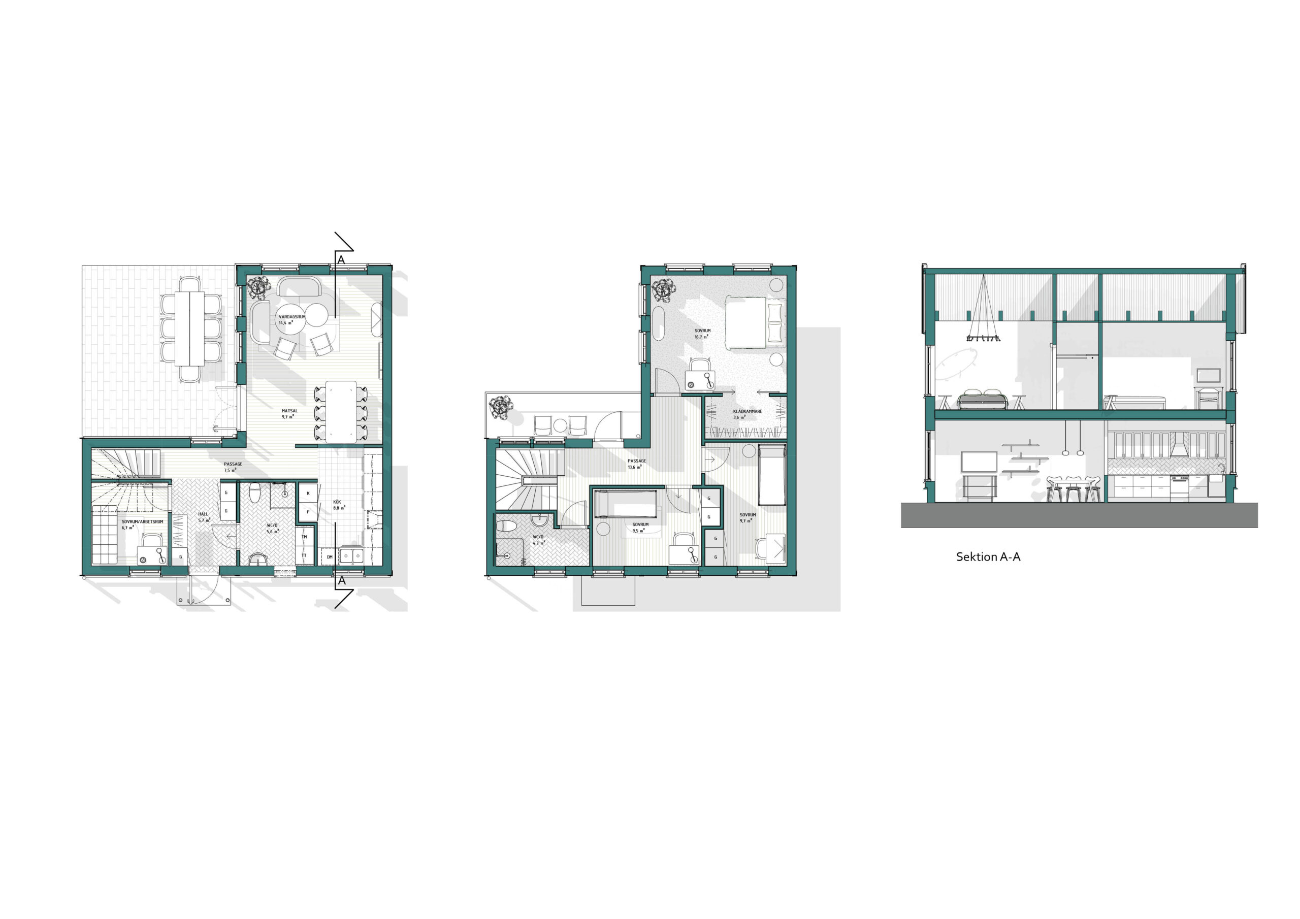 Husen utformas med ljusa, öppna planlösningar där stora fönster skapar kontakt mellan inne och ute. Sociala ytor samlas på bottenplan medan övre våningar ger lugn och avskildhet. Materialvalen kombinerar hållbarhet med värme och taktil kvalitet.