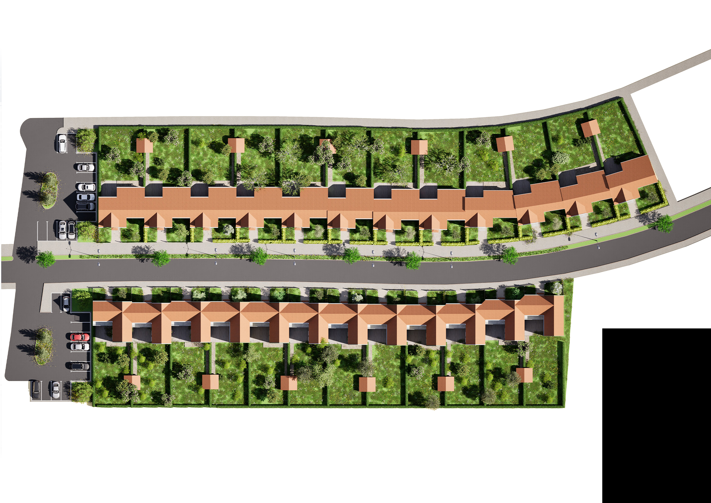 En central idé är de tydligt definierade förträdgårdarna. Genom att samla parkering vid områdets infart frigörs mark framför bostäderna, vilket skapar gröna, levande entrérum. Förträdgårdarna blir en mjuk övergång mellan privat och offentlig miljö, där häckar, växtlighet och sittplatser ger både struktur och liv.