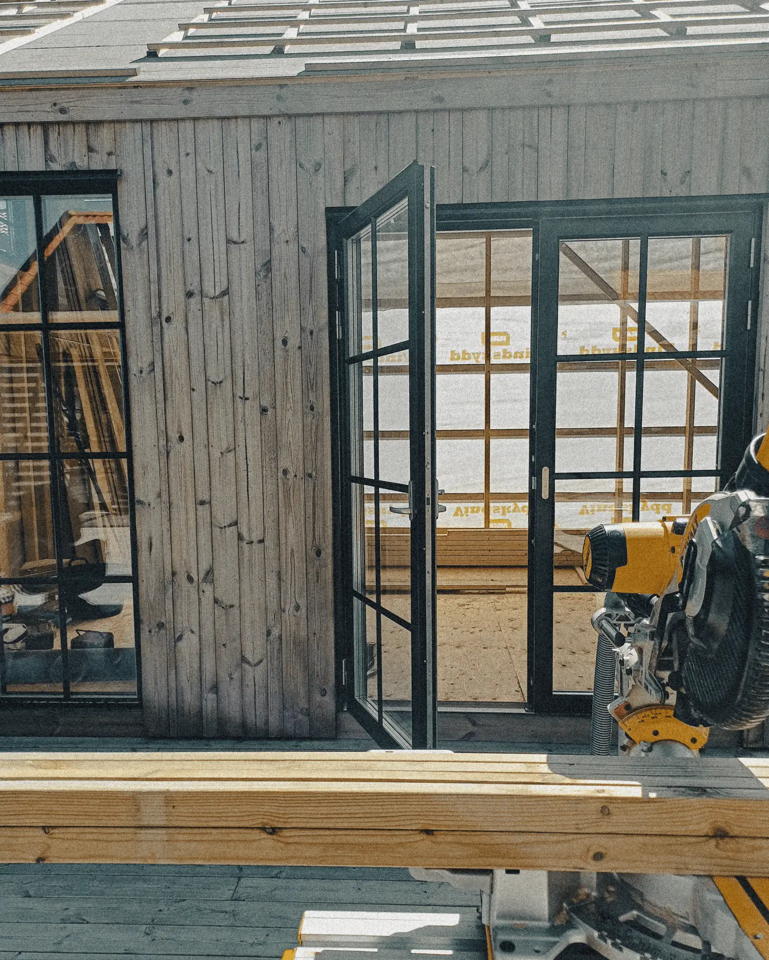 Långsidan öppnas generöst mot trädäck och huvudbyggnad. Glaspartier med smala, mörka profiler suddar ut gränsen mellan inne och ute och skapar ett flyt mellan vardagsrum, altan och attefallshus. På tomtsidan upplevs huset som ett ljust och öppet rum, medan fasaden mot grannfastigheten är tät och mer sluten för att begränsa insyn och rama in den privata uteplatsen.