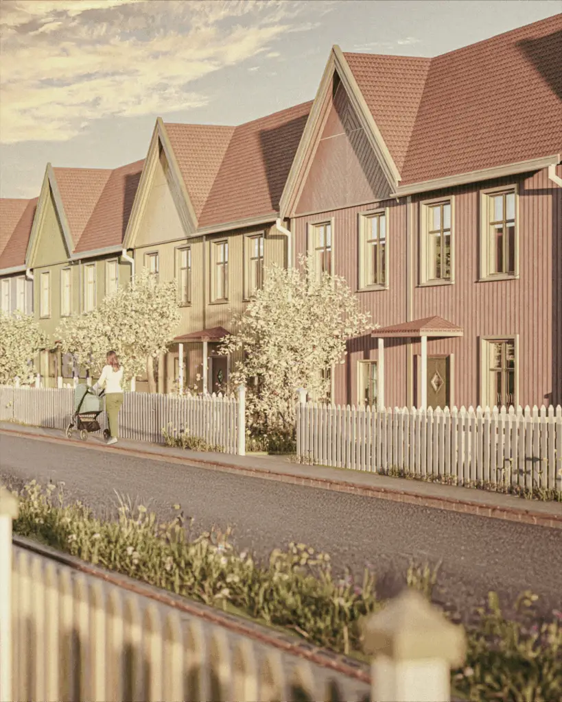 Detta tävlingsförslag tar avstamp i Alingsås karaktäristiska trähusbebyggelse de varma träpanelerna, den rikliga snickarglädjen och den mänskliga småskaligheten. Alla dessa element har inspirerat vårt gestaltningsgrepp. Genom att tolka den klassiska trädgårdsstadens principer med förträdgårdar och grönskande kantzoner skapar vi en ankomst som är både personlig och sammanhållen, där varje hem får ett eget uttryck men stilla smälter in i helheten.