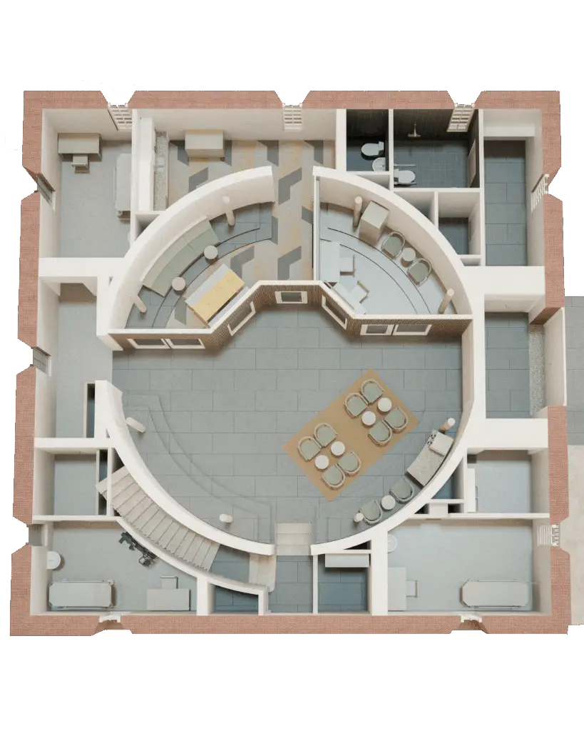 De specialritade snickerierna följer byggnadens rundade språk, och nya volymer har placerats med respekt för rummets ursprungliga rytm. Det gör att verksamhetens funktioner smälter in utan att bryta den arkitektoniska sammanhållningen.