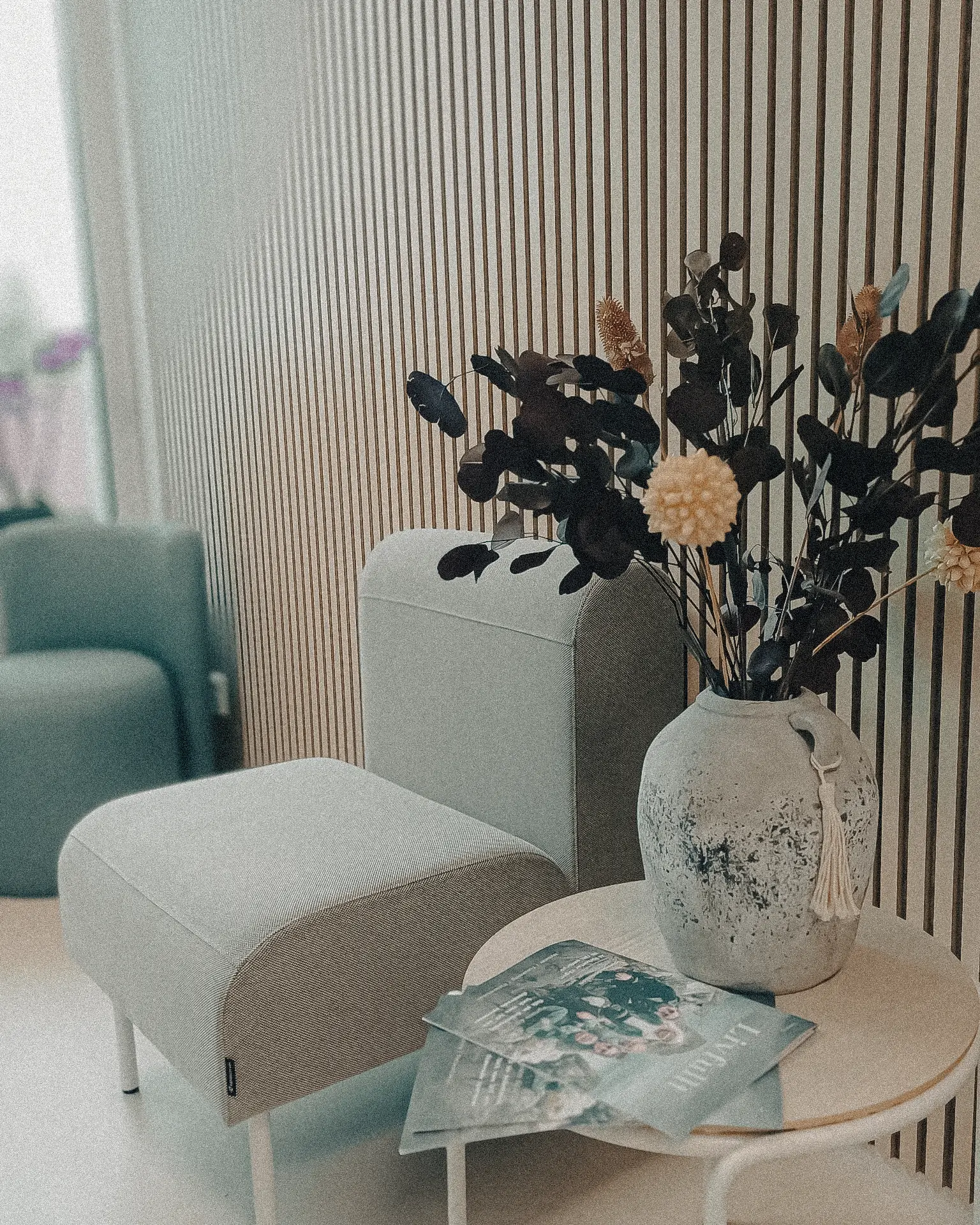 Naturinspirerade kulörer, behagliga texturer och subtila kontraster ger en inbjudande miljö där patienter känner sig trygga och välkomna. Samtidigt speglar paletten Livios grafiska profil, vilket förstärker varumärkesidentiteten genom väggar, snickerier och möblering.